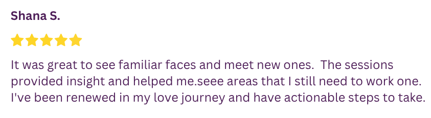 "...Got here and got so much more than I expected. I love how she curated every part of this event to make sure that not only did we come and learn things, but we actually had very actionable things to take away to implement in our love lives and our regular lives. It's not a regular event about relationships. It was a blessing to be here..."